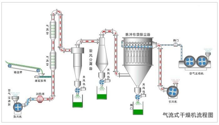 FG系列氣流干燥機的工作原理是將濕物料的干燥分為兩步完成。原料先由二級干燥之尾氣和補充熱氣的混合體進行一級正壓干燥,使用后的高溫低濕尾氣排出機外, 干燥后的半成品由新鮮的熱空氣進行二級負壓干燥。干燥后的成品計量包裝。使用過的高溫低濕尾氣用作一級干燥,從而完成良好的循環干燥過程,補充的熱風量可根據需要隨意調節,因而機器適用性廣。